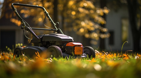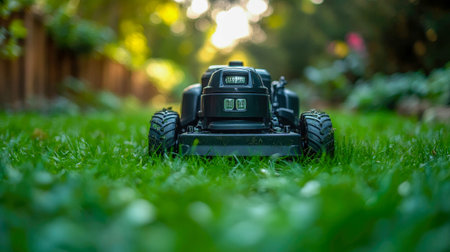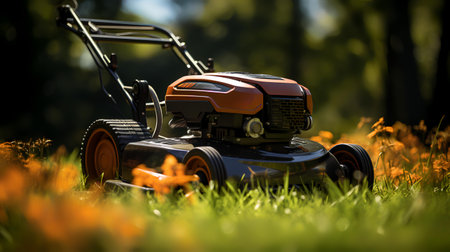 A lawn mower is parked on top of a vibrant, green field, ready to trim the grass. AI Generative