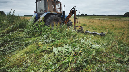 tractor with a mounted mower mows meadow forbs