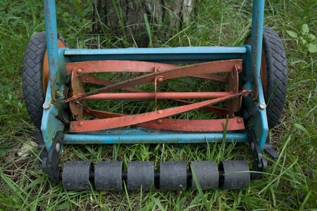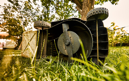 Gardening. Broken old lawnmower in backyard grass.