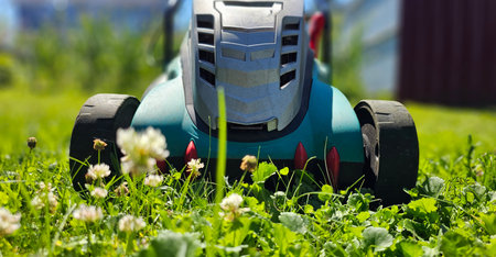 Electric lawn mower machine in garden on grass. Garden and lawn care theme. Banner format with copyspace