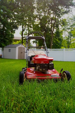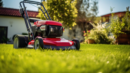 Lawn mower cutting green grass in backyard. Summer and spring season gardening background