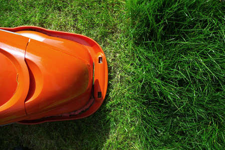lawnmower on green garden grass in sunny spring day