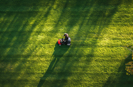 This aerial image showcases a lawn mower on a freshly cut grassy area, emphasizing the beauty of summer gardening and meticulous lawn care.