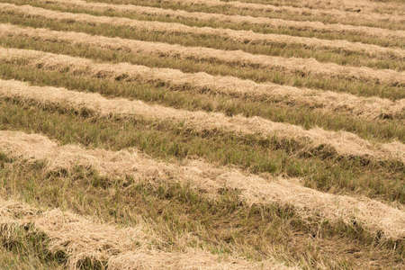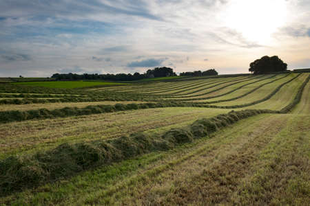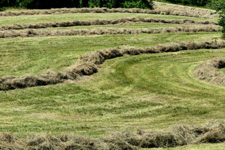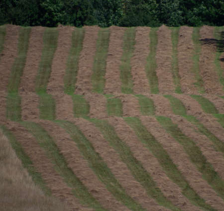 Lines of hay in the Dordogne countryside, collected ready for the baler