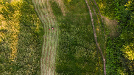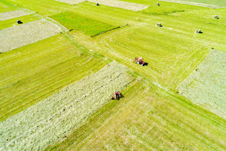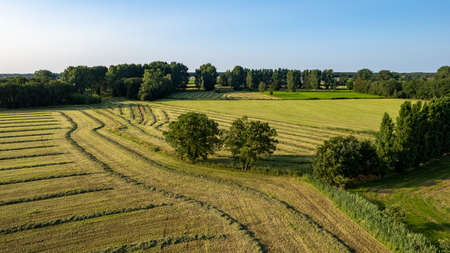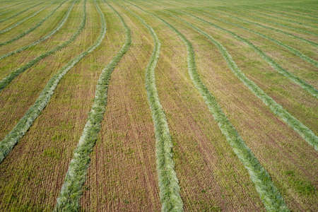 Aerial view of an agricultural field with lines of freshly mown meadow in warm temperatures on a sunny summer day, taken with a drone. High quality photo