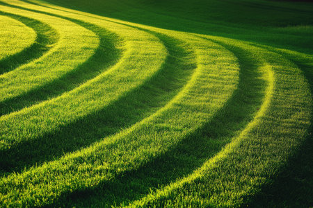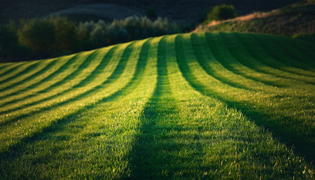 Rolling green hillside with striped mown grass and dramatic sunlight shadows. Clear details and vibrant color...