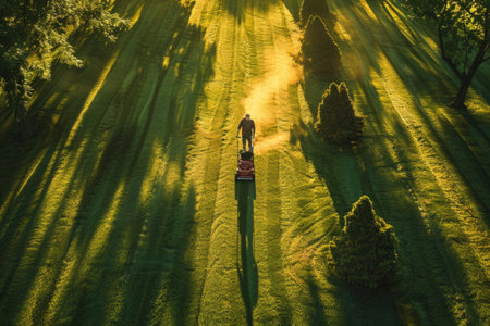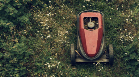 An overhead view of a vintage lawn mower resting on lush green grass adorned with delicate white wildflowers, capturing the essence of serenity in a garden space.