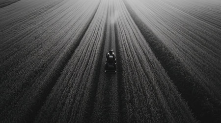 This striking black and white aerial photograph captures a farmer driving a tractor through neatly arranged crop rows in a vast field during dusk.