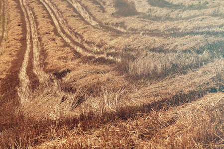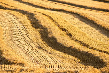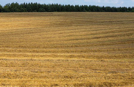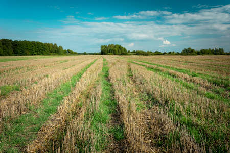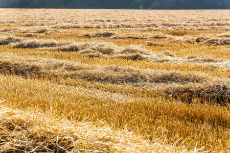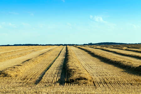 long straight rows of straw after harvesting grain, landscape in the middle or late summer,