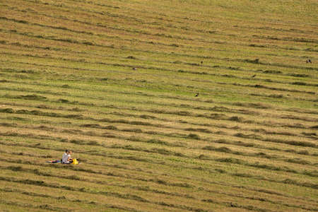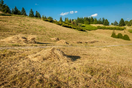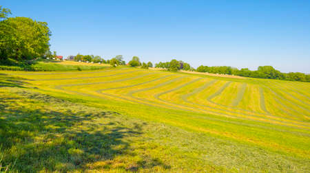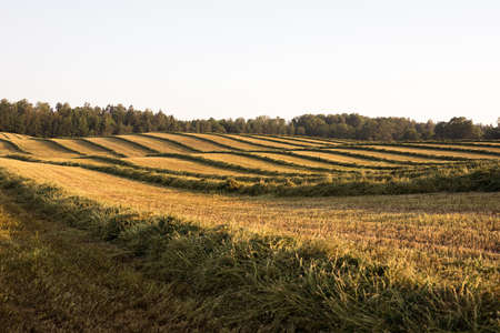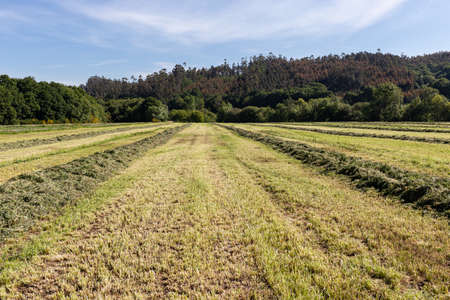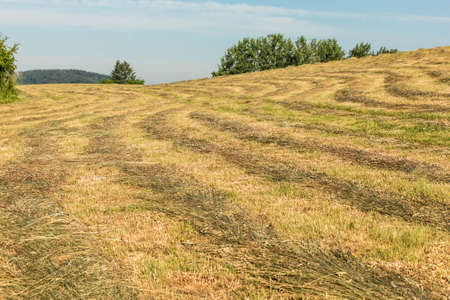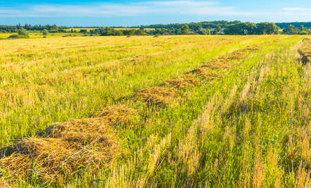 Freshly mown meadow in warm temperatures. Summer morning on the farm. Haymaking. Cattle feed.