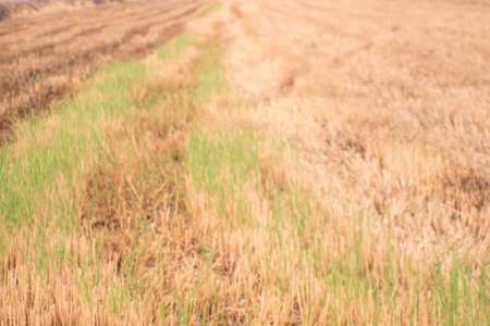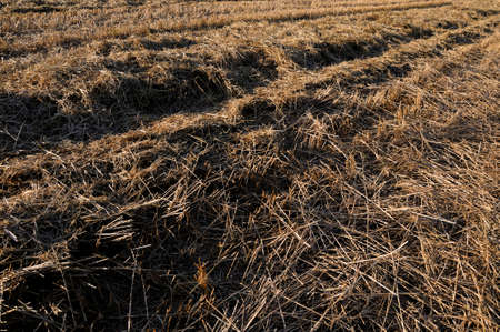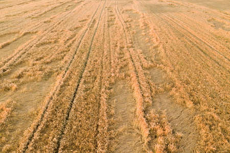 Traces of tractors in the high dry grass in nature, note shallow depth of field