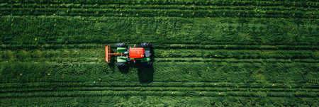 tractor in field at sunset with spraying of crops. a tractor is working in a farm field. aerial view or top view, by ai generative