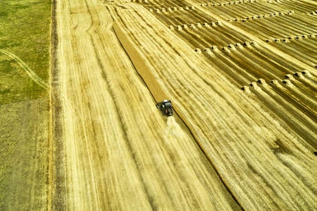 aerial view over modern heavy harvesters remove the ripe wheat bread in field. Seasonal agricultural work
