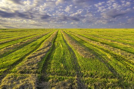 Sunset at cultivated land in the countryside on a spring evening with cloudy sky background. Procurement of food for animals. Combined field. Springtime rural landscape. Vintage film aesthetic.