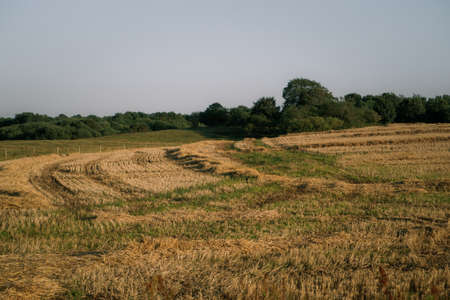 summer landscape with patterns and textures of new straw and a field of stubble under a blue sky