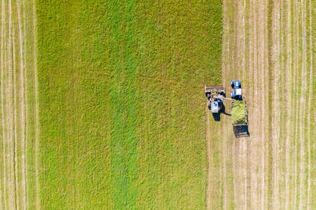 Aerial view of green grass harvest field with tractor moving hay bale in Finalnd