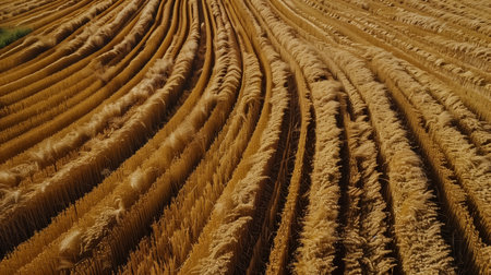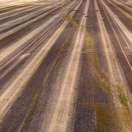 Aerial view of field. Rows of hay. Soil is very fertile. Crops have been recently gathered.