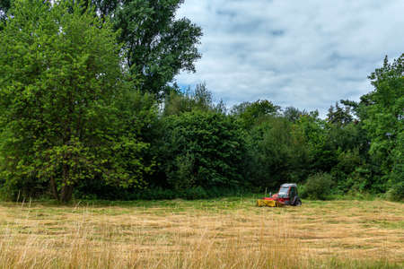 A small tractor mows the grass at the edge of the forest. White cumulus clouds in the sky.
