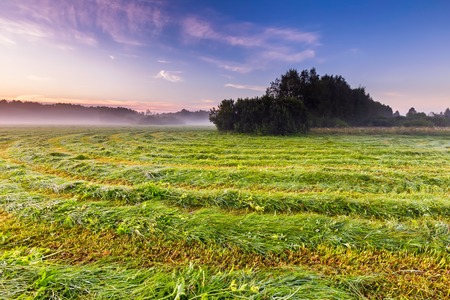 Morning foggy meadow in polish countryside. Beautiful sunrise on wild meadow