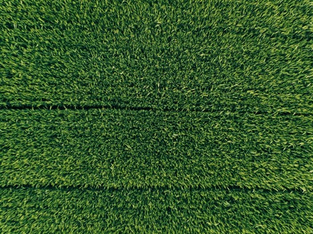Top view of green grass texture: spring lawn, fresh field and natural background in bright colors.