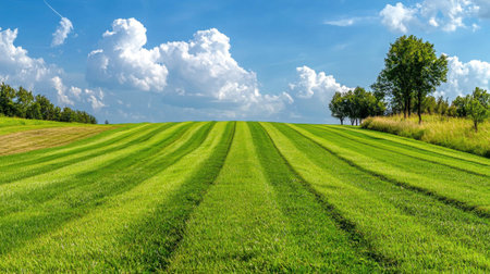 Expansive view of a beautifully manicured grass field featuring a striking striped mowing pattern. This image captures the essence of nature's tranquility and vibrancy.
