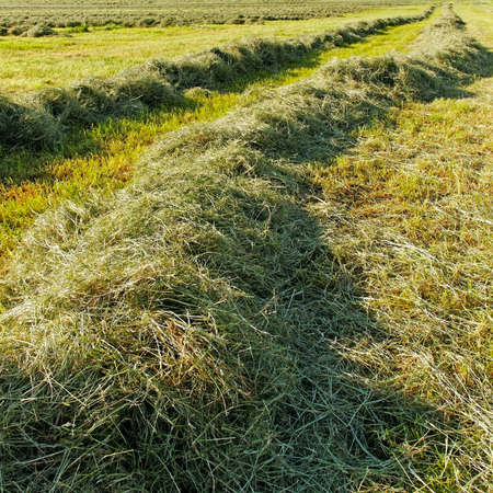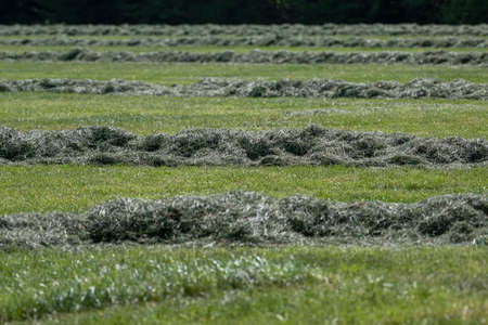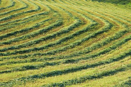 Curving swaths of freshly mowed green grass for silage on the agricultural field. Pastures for animal food