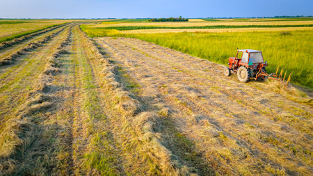 Tractor with attached mechanical rake is turning and gathering dry moved grass to arrange in long lines for hay bundles or bale. Agricultural machinery, wheel finger rake to turn dried crop on meadow