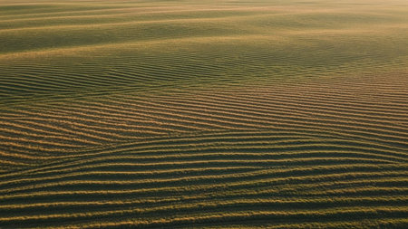 Aerial view of a large green field with distinct, straight horizontal rows creating a strong striped pattern under soft sunlight.