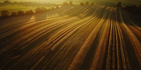 An aerial perspective reveals rolling agricultural fields with distinct parallel rows of green and golden crops. Long shadows stretch across the textured landscape,...