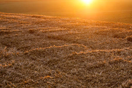 Wheat farm field at harvest. Rural landscape. Golden harvest of wheat in the evening. Straw field