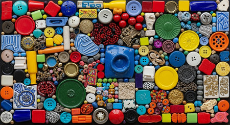A lively and colorful flat lay composition featuring a wide array of buttons and small decorative craft The arrangement is densely packed on a black background, showcasing a vibrant spectrum of colors including red, blue, yellow, green, and orange. The vary in size, shape, and with many round buttons, some square tiles, beads, and other small embellishments. The overall effect is a rich, textured mosaic of playful and creative