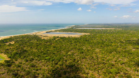 Aerial view of Lakes among the rainforest in the Kumana National Park. Sri Lanka. Tropical landscape.