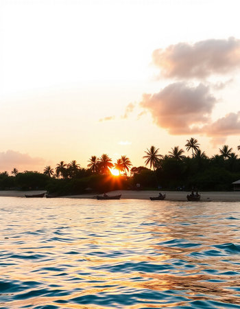 Tropical beach with palm trees at sunset in Maldives.