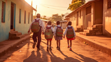 A group of young children with backpacks are walking to school on the dusty street. Back to school. Generative ai.