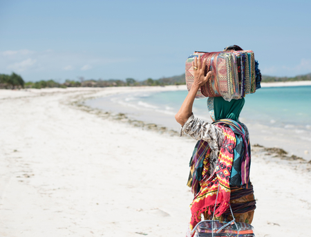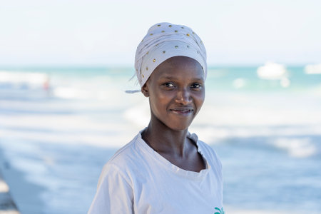 Zanzibar, Tanzania - october 28, 2019: African woman standing on the beach market near sea of Zanzibar island, Tanzania, East Africa