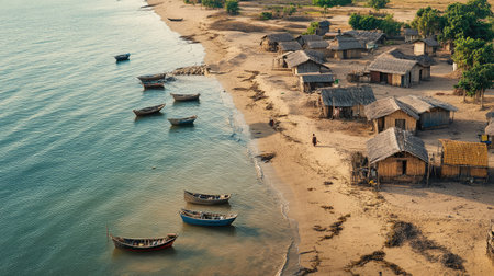 A remote fishing village on a desert beach, with small boats moored on the sand and huts along the shoreline.