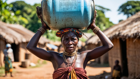 A sad woman carries a canister of water on her head in a village in Congo