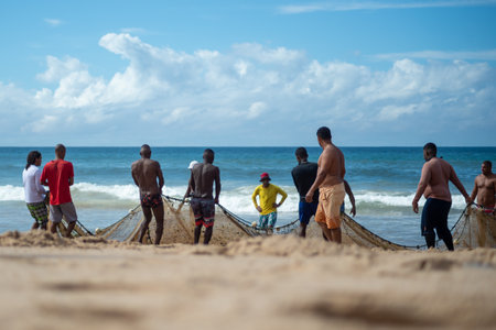 Salvador, Bahia, Brazil - May 23, 2021: Fishermen pulling the fishing net from the sea with fish inside. Boca do Rio beach in Salvador.