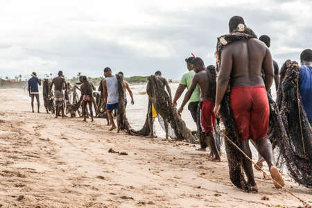 Salvador, Bahia, Brazil - January 11, 2020: Fishermen laying siege to fish with a large fishing net.