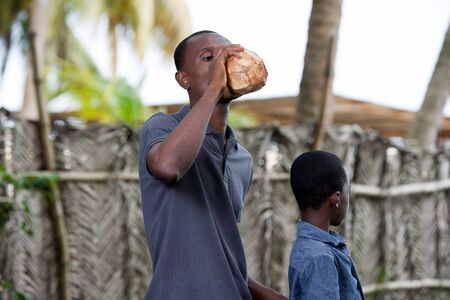 a young man standing near a straw fence drinking his coconut juice while his little brother watches something.
