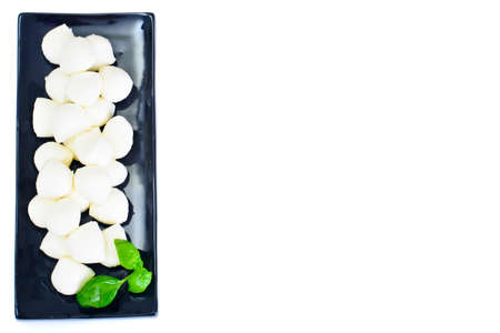 Italian food, fresh fresh green basil and white mini mozzarella soft balls cheese close up