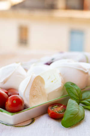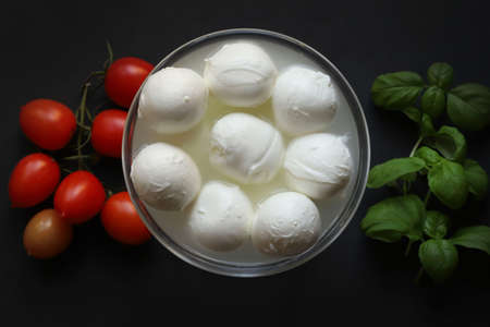 Cheese collection, balls of fresh Italian soft cheese mozzarella di bufal campana served with fresh basil and tomatoes