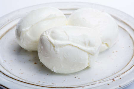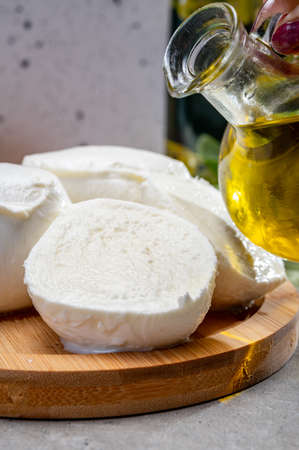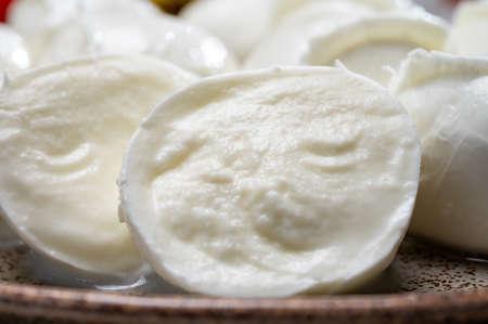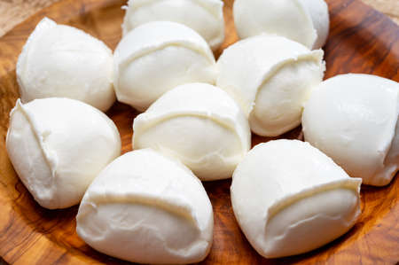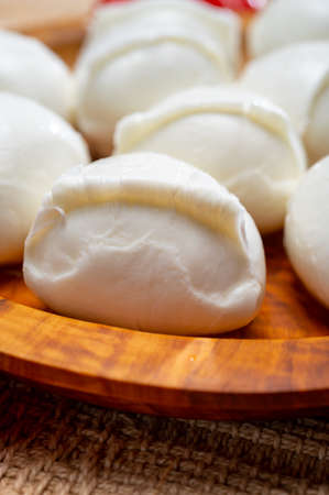 Fresh handmade soft Italian cheese from Campania, white balls of buffalo mozzarella cheese made from cow milk ready to eat close up