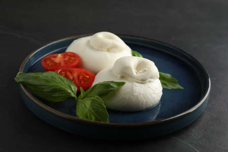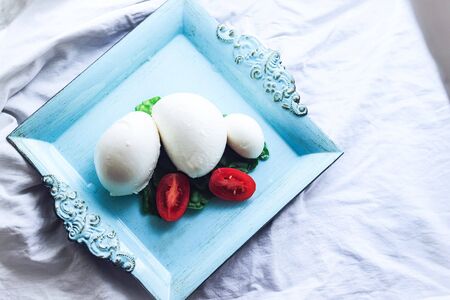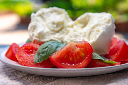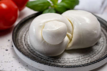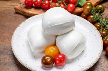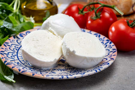 Fresh soft Italian white cheese mozzarella buffalo, original from Campania, Paestrum and Foggia regions, South Italy, served with tomatoes and fresh basil