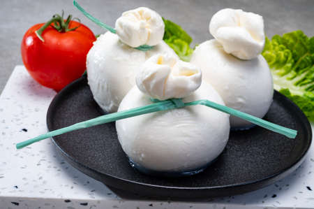 Cheese collection, fresh soft Italian cheese from Puglia, white balls of burrata or burratina cheese made from mozzarella and cream filling close up