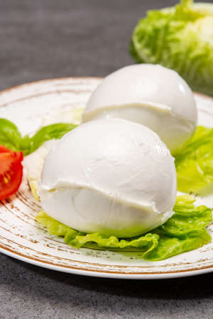 Сheese collection, balls on soft white mozzarella bufala cheese served with green cos lettuce and tomato close up
