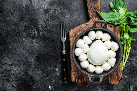Mozzarella cheese mini balls in pan with basil. Black background. Top view. Copy space