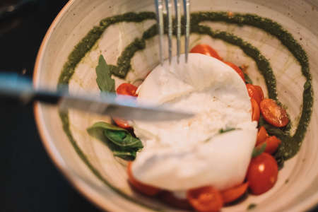 Cheese collection, eating of white soft Italian cheese mozzarella, served with red cherry tomatoes, fresh basil leaves close up