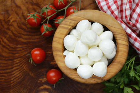 Italian tricolore, small balls of fresh white soft Italian mozzarella cheese, ripe red cherry tomatoes and fresh green basil herb, ready for making caprese salad, close up