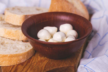 Mozzarella cheese balls, fresh white mini slices as an ingredient for Mediterranean food. Mozzarella cheese as a background for your design